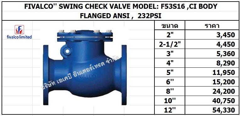 สวิงเช็ควาล์วเหล็ก แบบหน้าแปลน หรือ วาล์วปิดกั้นน้ำ ยี่ห้อ FIVALCO รุ่น F53S16 ทำหน้าที่ ปิดกั้นน้ำให้ไหลไปในทางเดียว โดยอัตโนมัติ เมื่อน้ำไหลผ่านวาล์วได้ในทิศทางเดียวกัน และลิ้นของวาล์ว จะปิดกั้นทันทีที่น้ำหยุดไหล ป้องกันความเสียหาย ของอุปกรณ์ นิยมใช้ตามบ้านเรื่อง และโรงงานอุสหกรรม