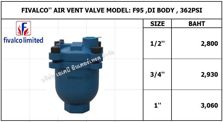 วาล์วระบายอากาศ (AIR VENT VALVE) ยี่ห้อ FIVALCO รุ่น F95 ทำงานโดยการ ทำหน้าที่ ระบายลมออกจากท่อน้ำ ใช้สำหรับงานระบบประปา